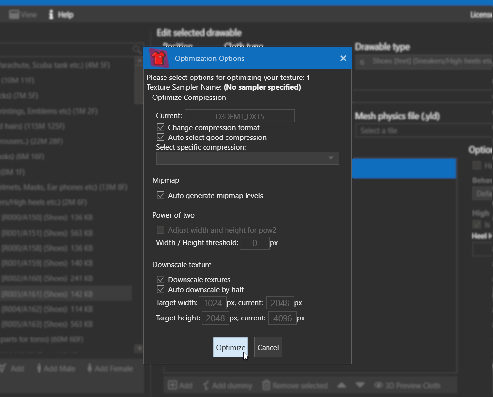 Durty Cloth Tool (DCT) provides a powerful **Optimization** feature that allows users to optimize embedded textures in cloth drawables (YDD) as well as individual textures in cloth texture variations (YTD). This feature is designed to improve performance by reducing the size of textures, ensuring proper mipmap levels, and adjusting texture resolutions to power-of-two dimensions (commonly used by game engines for better rendering efficiency).